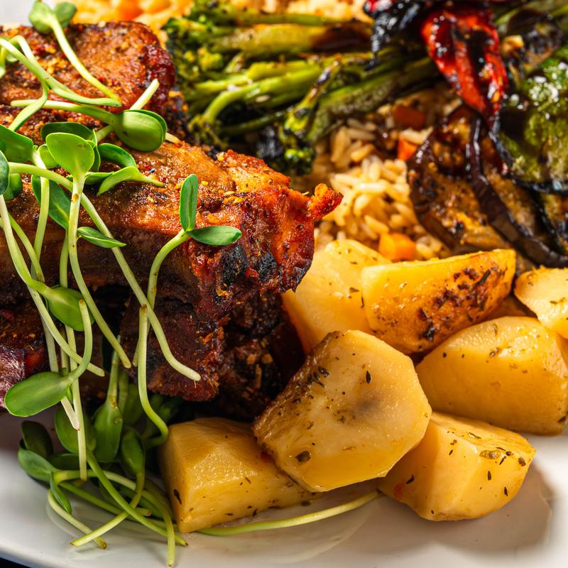 Marinated slow-roasted lamb shoulder covered in red sauce with Greek herbs and spices. Served with rice pilaf, roasted Greek potatoes, and a grilled vegetable medley.